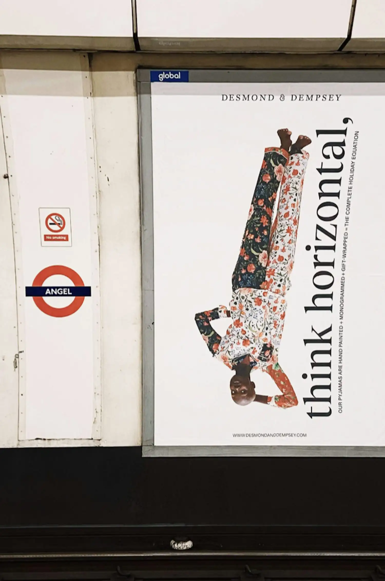 Tube advertising across twenty-five stations for the holidays presenting D&D pyjamas as the quintessential holiday gift. The copy placement is strategically provocative, enticing commuters to tilt their heads for a read, mirroring the laid-back comfort of being horizontal at home.